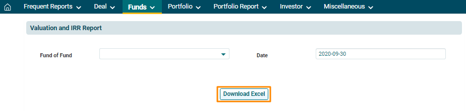 3. The Valuation & IRR Report window is displayed. Choose the Fund from the drop down list. Specify the date until which you wish to download the report. Click on Download Excel button. The excel file will download.