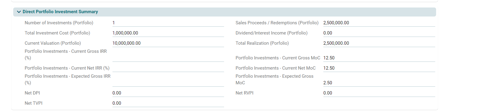 In this panel, AIF can view details of direct portfolio investment and return on those investments. This is an auto-populated panel flowing from Portfolio Investments tab.