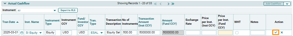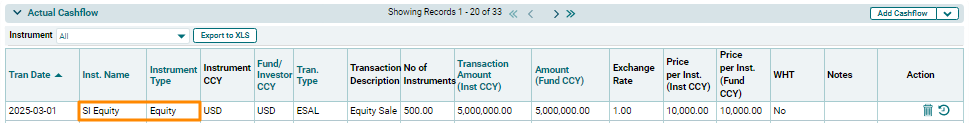 In the Actual Cashflow tab, you can add and manage actual cashflows for all the instruments.