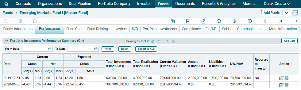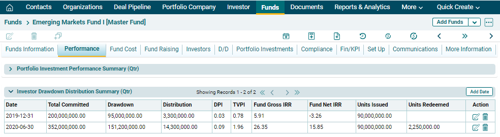This tab contains information about Portfolio Investment Performance Summary (Qtr), Investor Drawdown Distribution Summary (Qtr), Fund Cost.Portfolio Investment Performance Summary (Qtr)