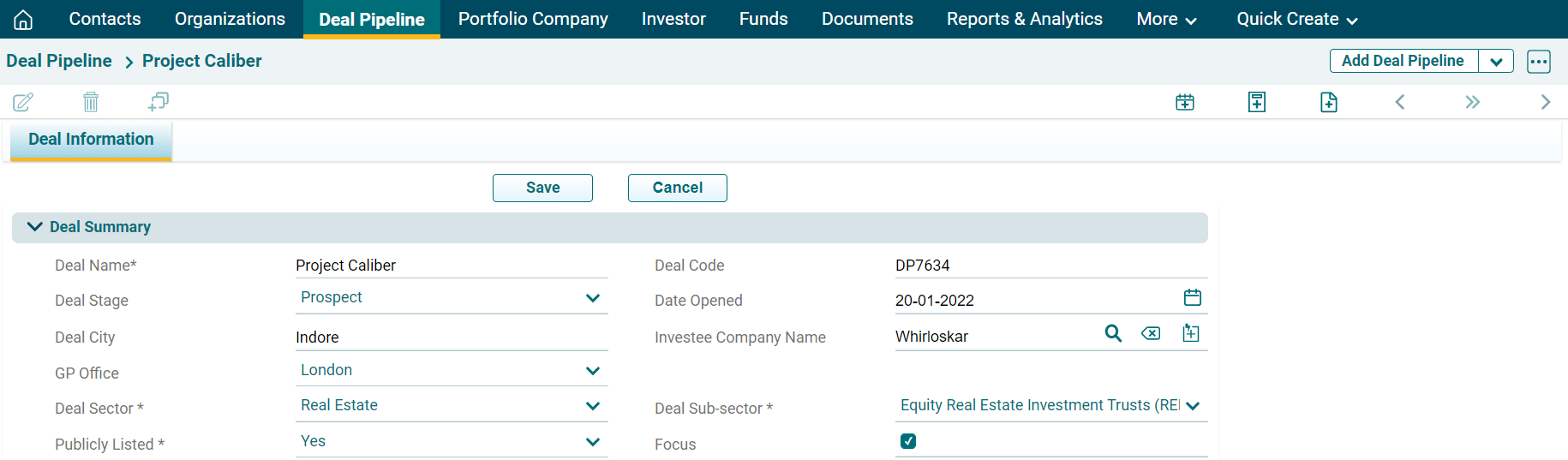 4. Once the Deal has been created, you will see different tabs here: Additional Information, Teams, Funds/Co-Investors, Workflow, Notes, and More Information. Fill in all the details by navigating to the respective tabs.