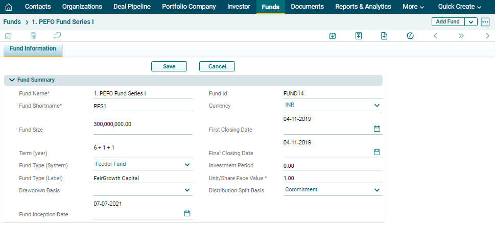3. The Fund window is displayed. Update the mandatory details and click Save.
