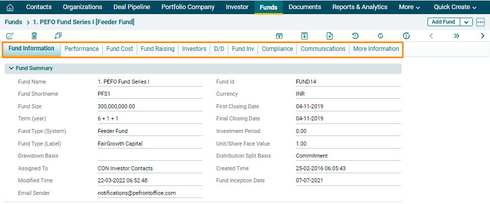 4. Once the Investor has been created, you will see different tabs here- Performance, Fund Cost, Fund Raising, Investors, D/D, Fund Inv, Compliance, Communications, More Information. Update the details by clicking the respective tabs.