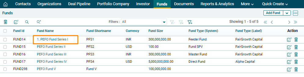 5. The created Fund can be accessed from the Funds menu. The company is visible on the Funds list page.