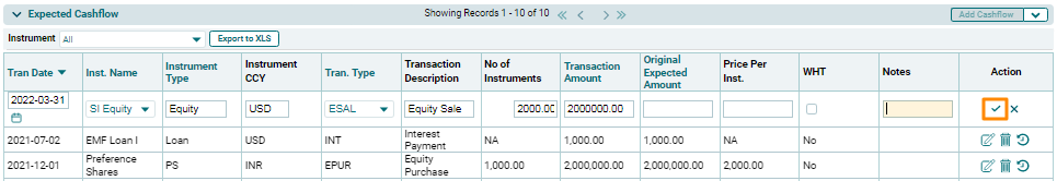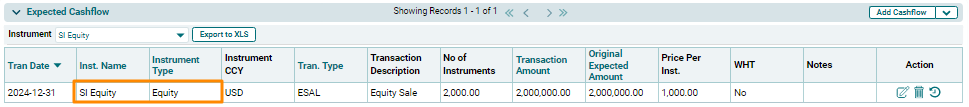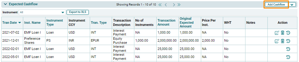 In the Expected Cashflow tab, you can add and manage expected cashflows for all the instruments.
