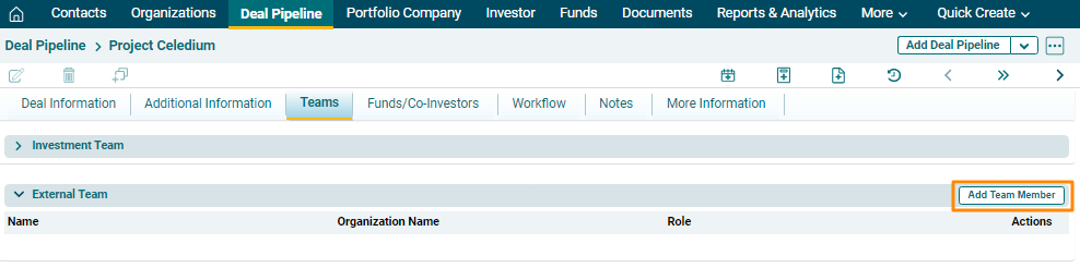 Investment Team panel captures details of internal team members associated with the deal. The details included are: