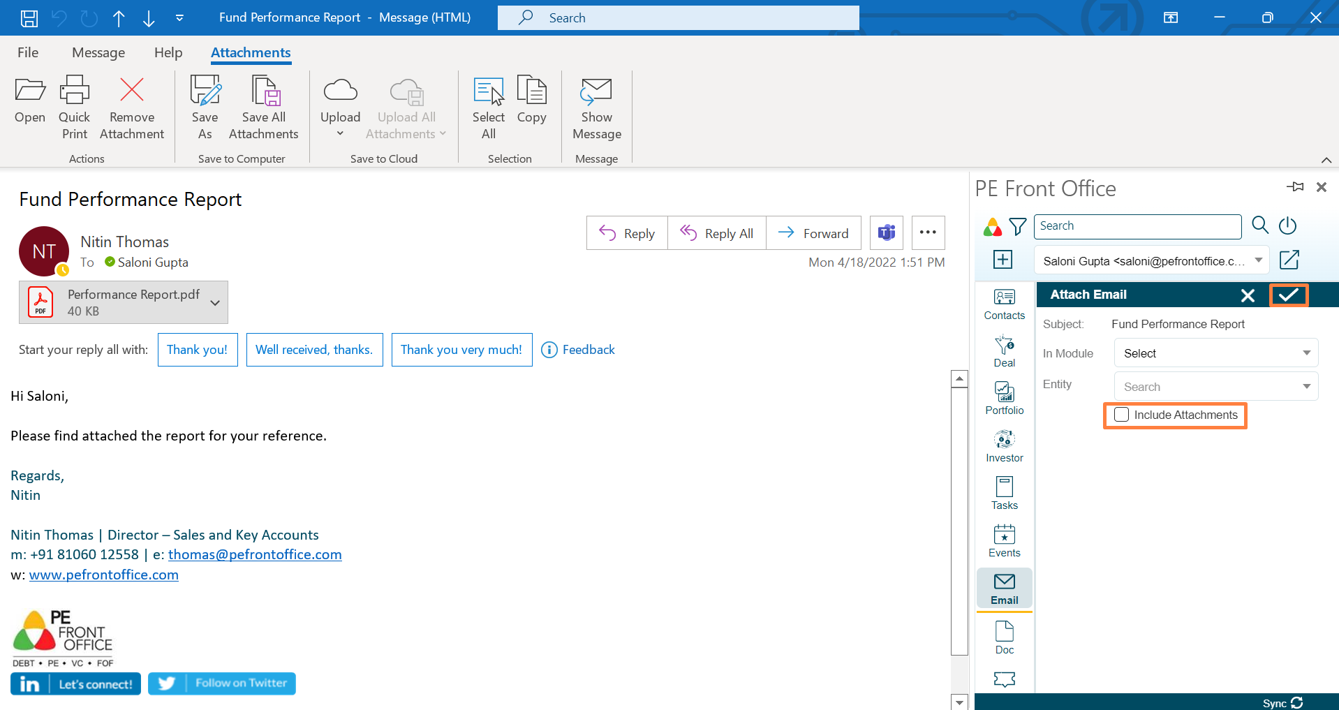 3. Update the details. Click Include Attachments checkbox to attach any documents. Click on Check button to save.