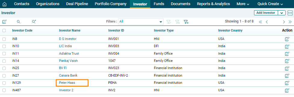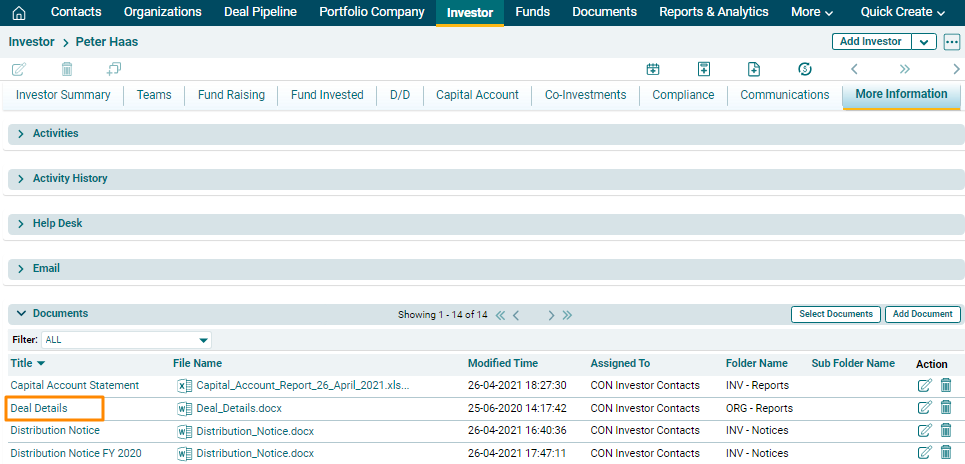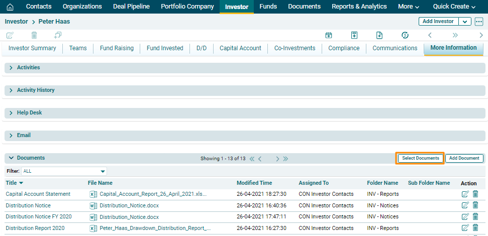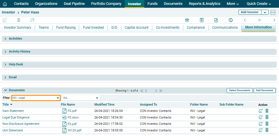 To view documents of a specific folder, you can use the filter on top left corner of the panel. You can choose a folder from INV Legal, INV Reports, INV Notices, INV New Test Folders, INV Tickets, INV Trouble Tickets, INV Test, INV Due Diligence, INV KYC, and INV Subscription Forms.