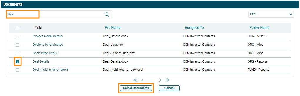 3. The Documents window is displayed. Type the file name in the search box. Check the checkbox against the file name. Click on Select Documents button.