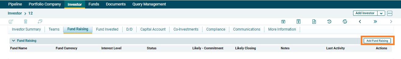 The Fund Raising panel contains information about potential investors who can invest in funds. The details included are: