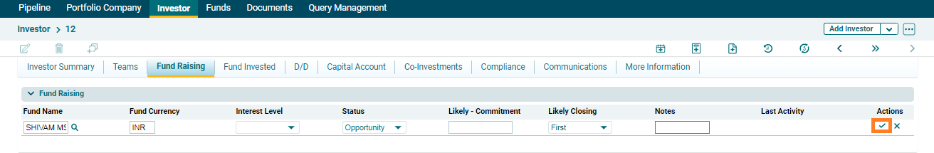 • Interest Level: Select the investor’s interest level in the fund whether low, medium, or high.