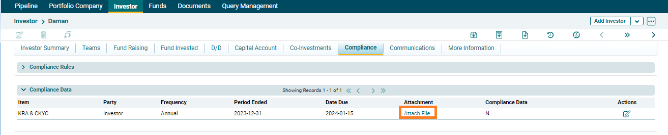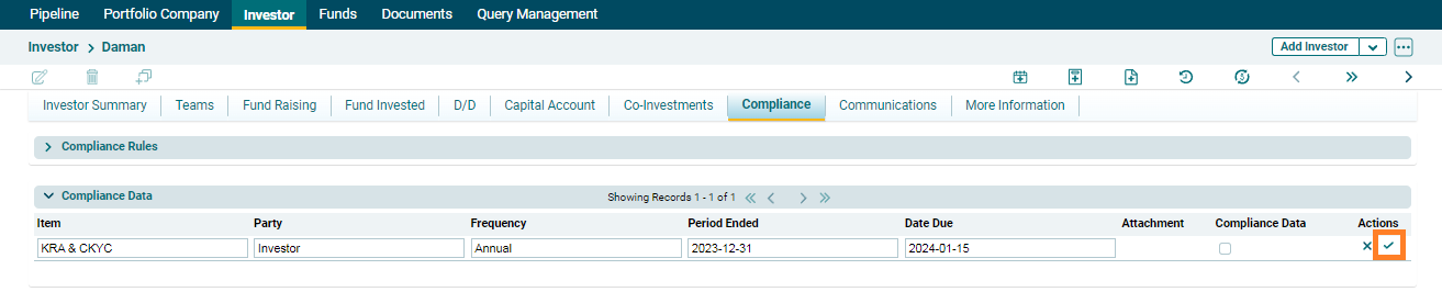 Once the rule has been defined for an item in the Compliance Rules, the Compliance Data panel allows you to capture the required documentation associated with the compliance rule.