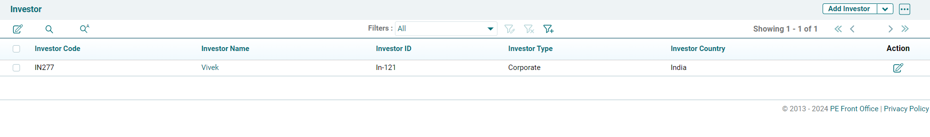 3. Investor will get created in the platform which can be viewed in the list view page
