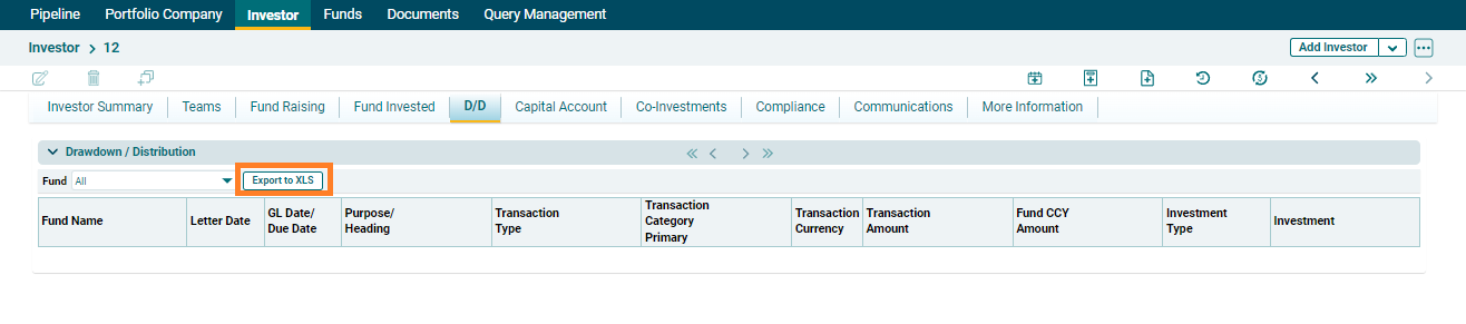 To export the Drawdown/ Distribution details into excel, click on Export to XLS button in the horizontal bar of the panel. The excel file will be downloaded.