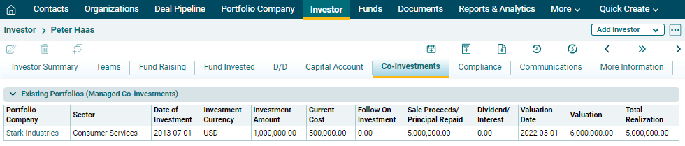 has made in the portfolio companies along with the fund. The panel gets auto-populated based on the