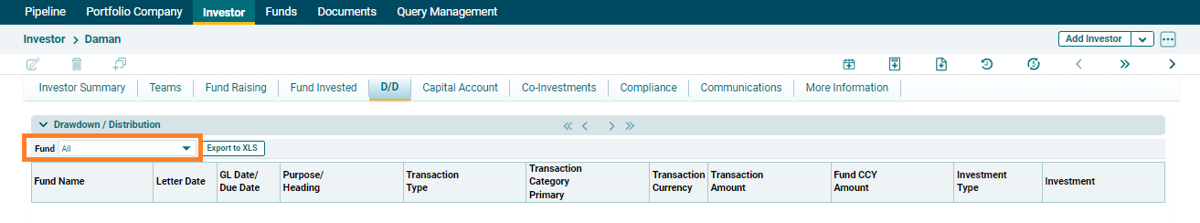 This panel allows you to see drawdown and distribution details regarding a fund or all funds in which the investor has invested.