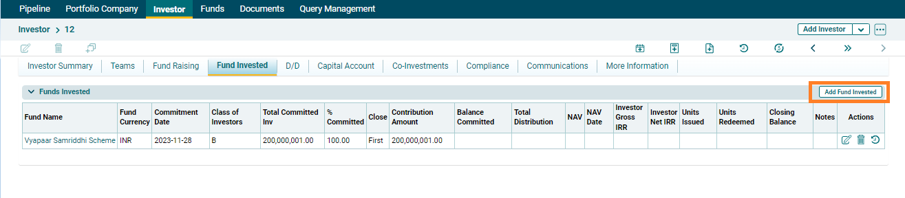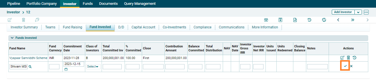 The Funds Invested tab allows you to capture details of the funds in which the investor has invested. The details included are: