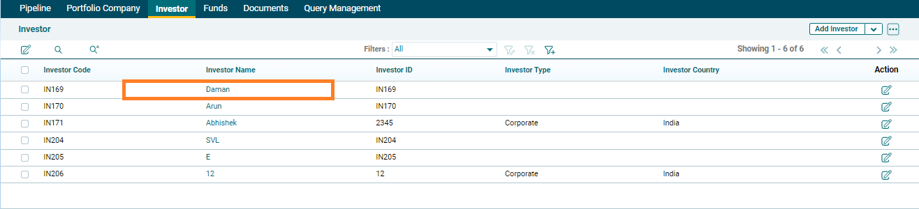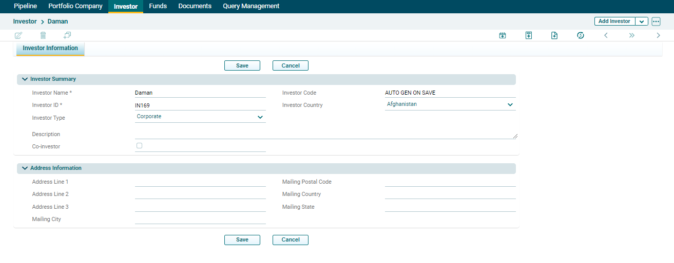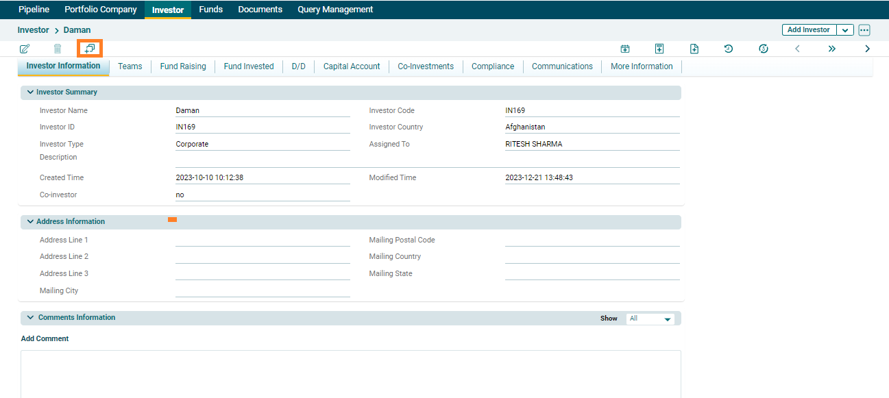 2. The Investor Information window is displayed. Click on the Duplicate icon in the top left corner.