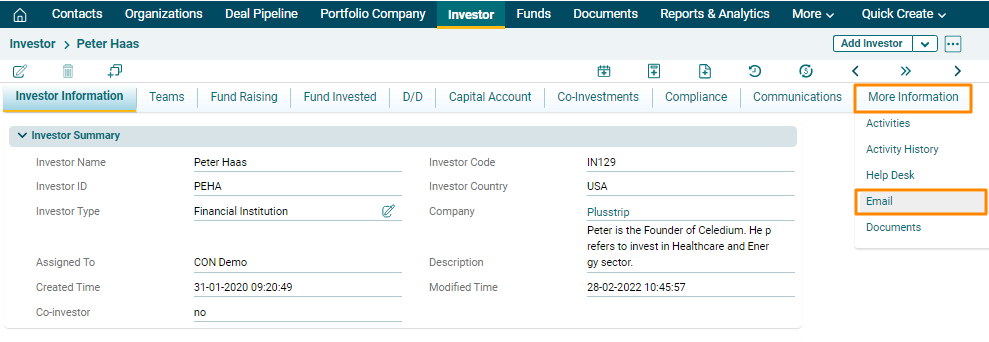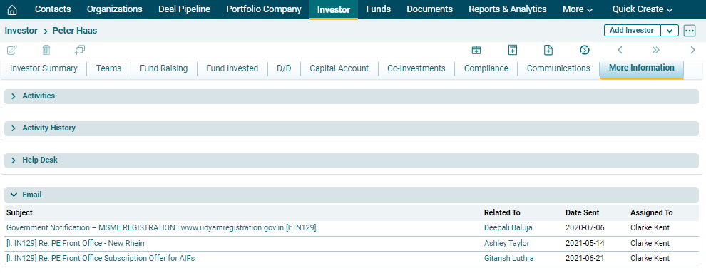 In the Email panel, emails can be attached to a particular investor from Outlook Plugin. To view Emails, follow the below steps: