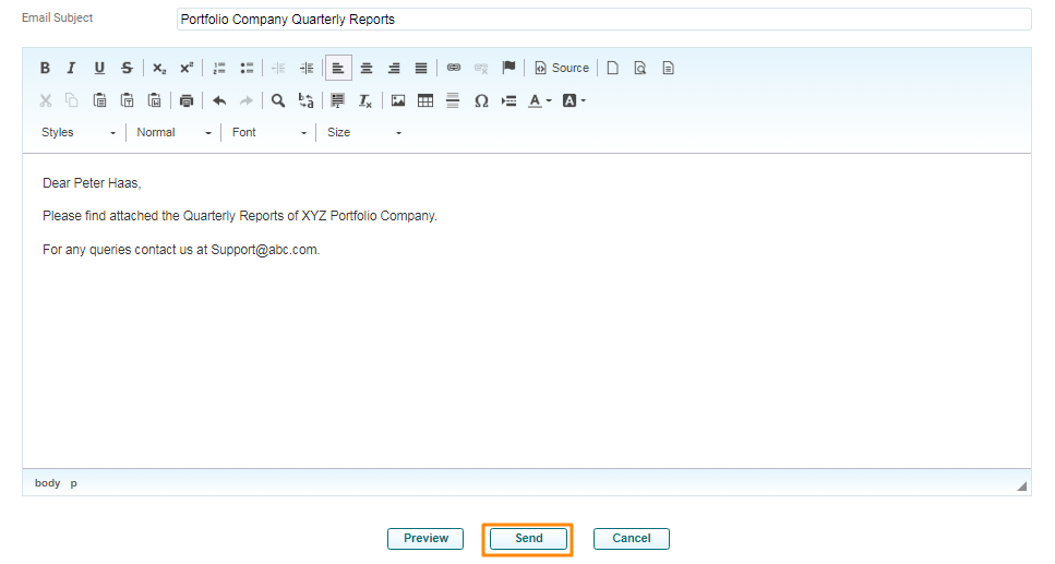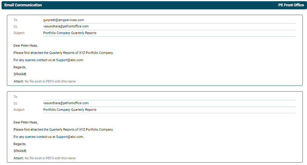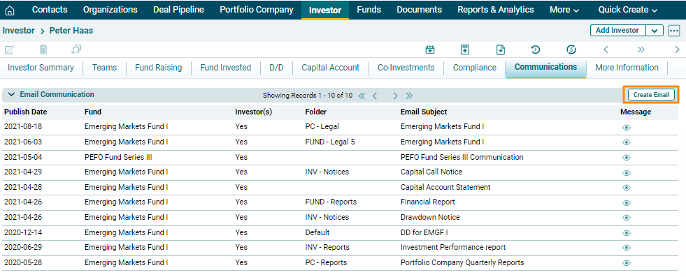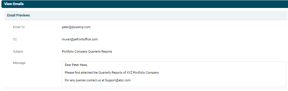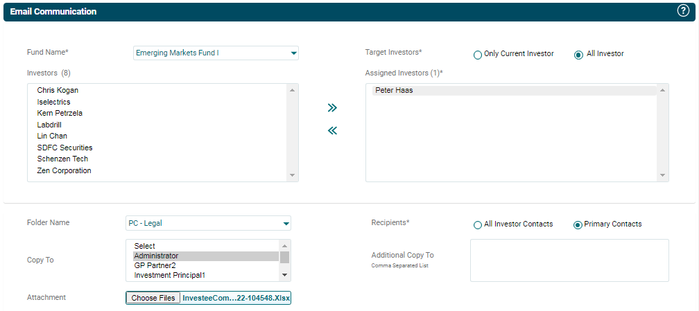 Email Communication panel allows you to send email communication to one or all of the investors from the system itself and keep a track a log of all emails sent.