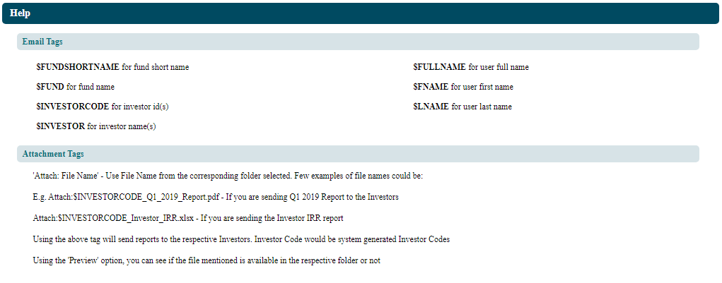 3. You can use tags when sending investor-specific emails to multiple investors and their contacts. Use a tag to replace it with investor-related information. E.g., you can use tag $Investor Code for investor ID. The software will pick the software ID and replace the tag with the related investor’s codes. You can also use Attachment tags to attach investor-specific attachments. To know more tags, click on Help (
