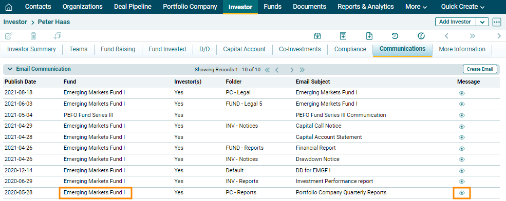 7. The sent email appears in the Email Communication panel. To view the sent mail, click on the View Message icon in the Message column.