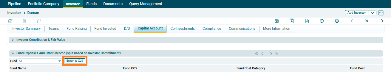 To export the fund expense and income details into excel, click on the Export to XLS button in the horizontal bar of the panel. The excel file will download.