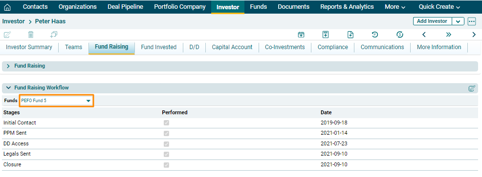 The Fund Raising Workflow panel allows you to capture the stages of fundraising that an investor goes through during the investment process in a fund.