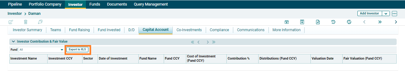 To export the investor contribution & Fair Value details into excel, click on Export to XLS button in the horizontal bar of the panel. The excel file will download.