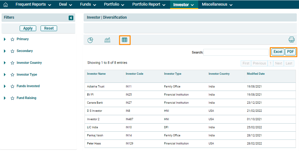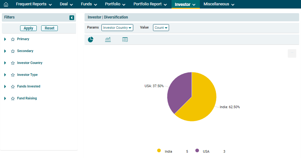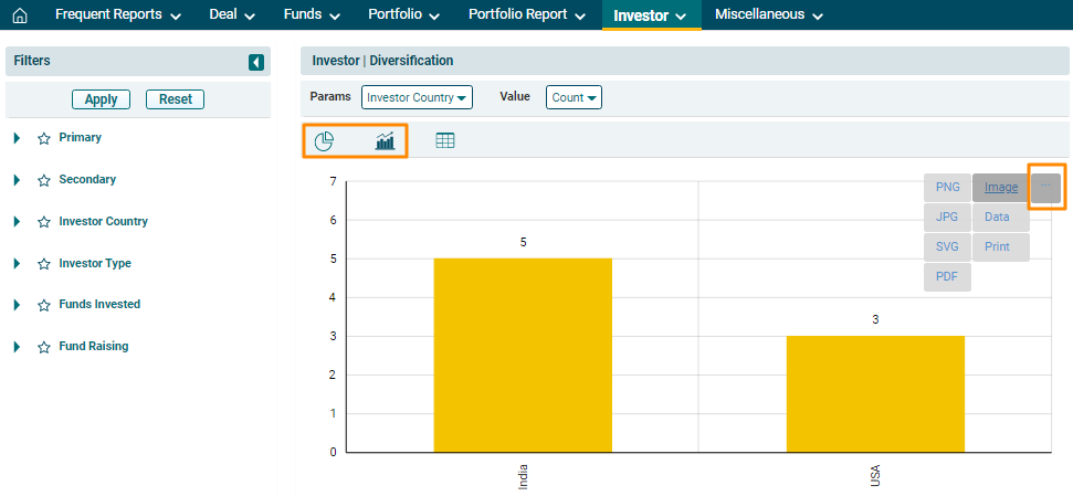 5. You can view the above data in Bar Graph and Pie chart. Click on the icons below the filters to view the diversification in the desired format. You can download the report in various formats. Click on the gray square box button in the top right corner near the graph. The report can be downloaded in image formats, such as PNG, SVG, JPG, etc., and data formats, such as JSON, HTML, PDF, CSV, etc. Click on a format and the report will be downloaded.