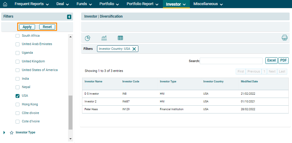 7. To further drill down into the analysis, use the additional filters on the left-hand side. Select a filter and click on Apply. To reset the filters, click Reset.