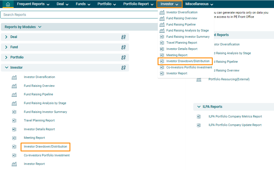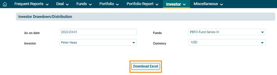 clicking Investor Drawdown/ Distribution in the Investor panel