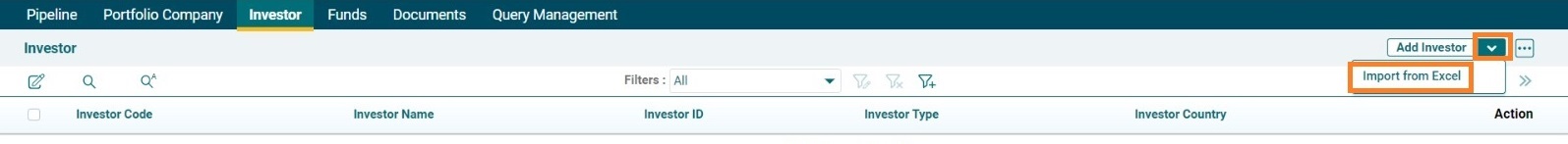3. As a next step , AIF user need to click on arrow on top right corner and click on Import from Excel and select and upload the saved excel template.