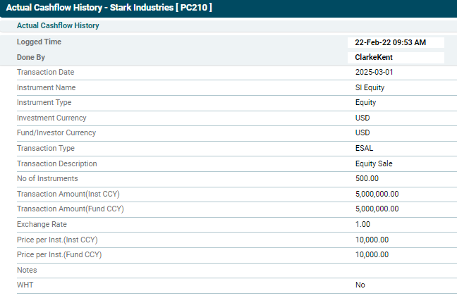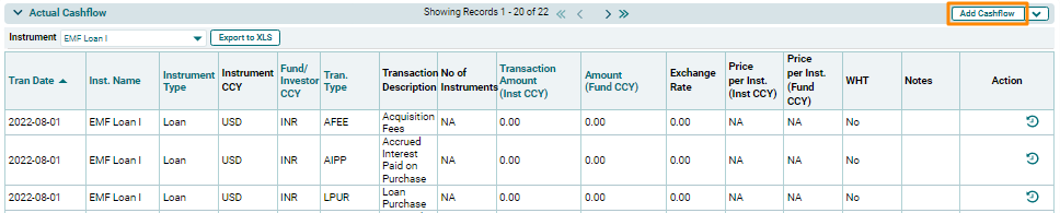 In the Actual Cashflow tab, you can add and manage actual cashflows for all the instruments.