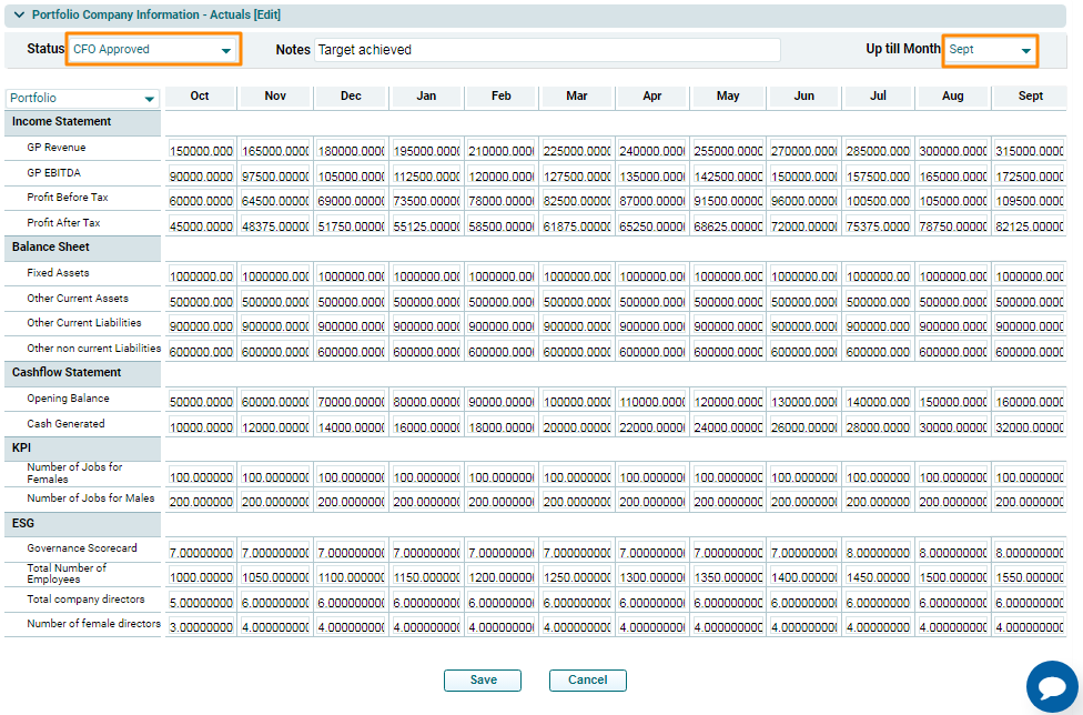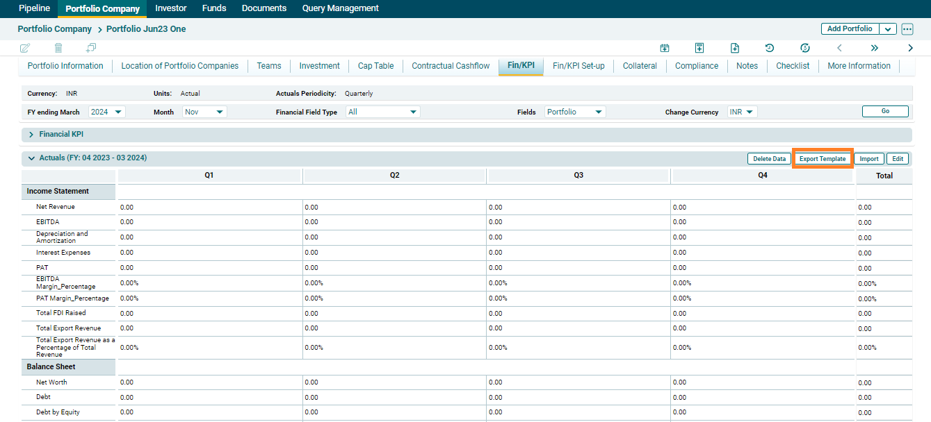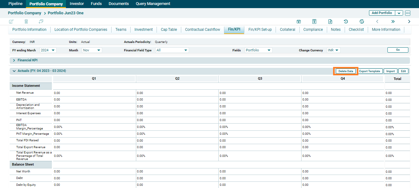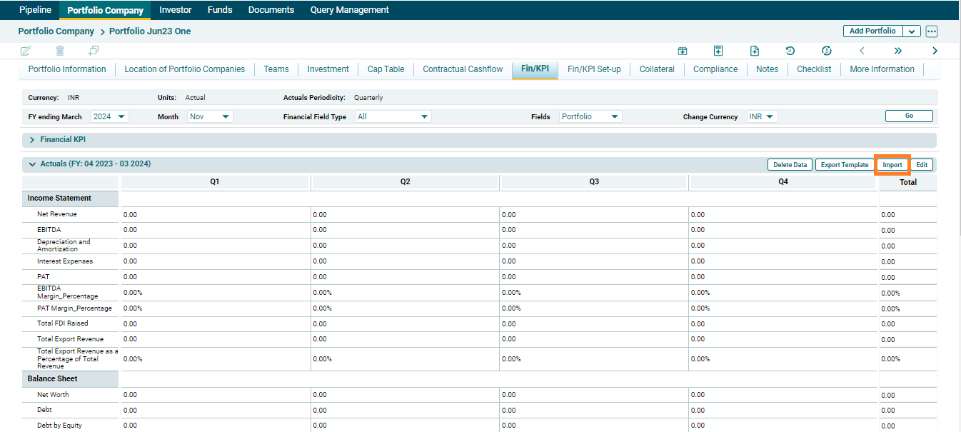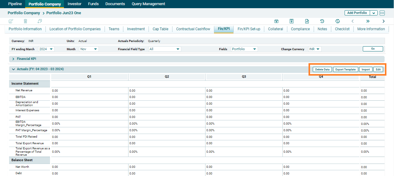 You can capture three cases of Financials/KPI - Actual, Budget, and IC. You can edit data on the screen, import data via excel, export data to excel, and delete data for each of these cases.