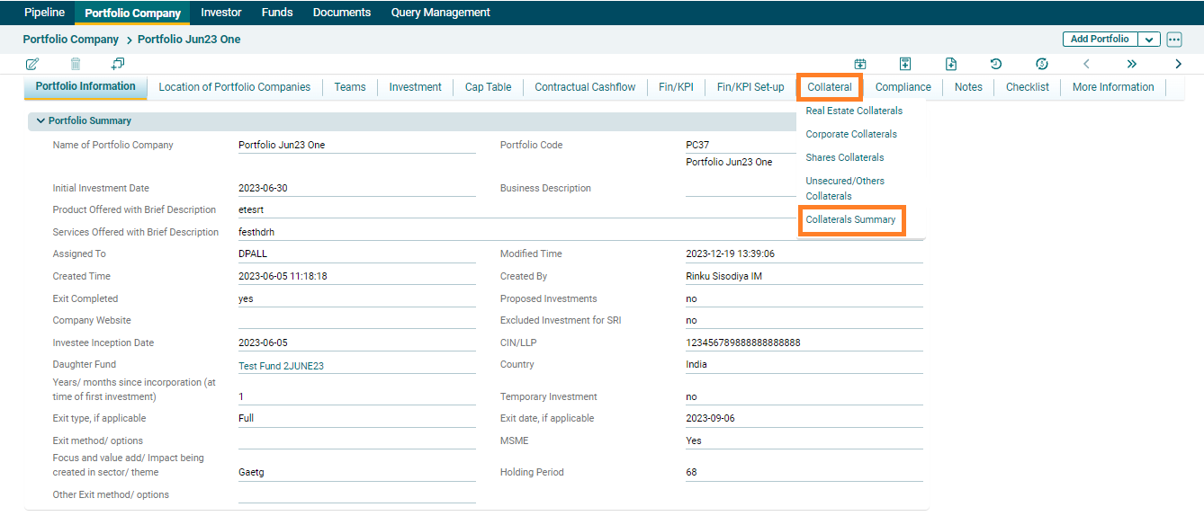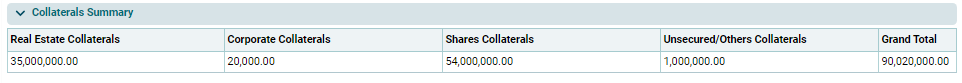 Collaterals summary panel allows you to view a consolidated view of all different types of collaterals captured.