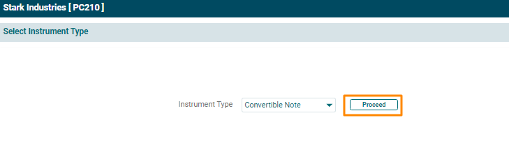 Instrument Type window is displayed. Select Convertible Note from the Instrument Type dropdown list. Click Proceed.