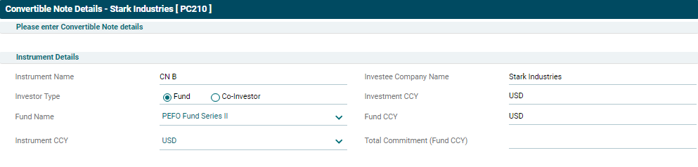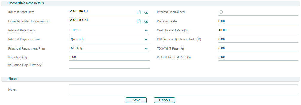 3. The Convertible Note Details window is displayed. Enter the following details: