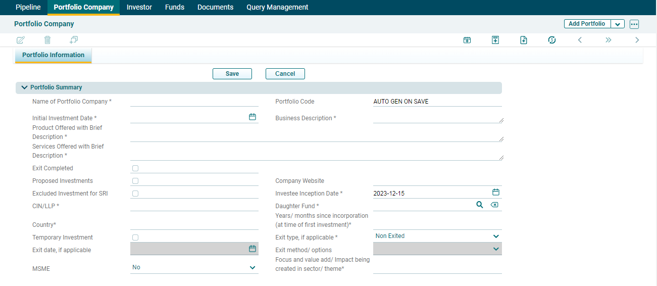 3. The Portfolio Information window is displayed. Update all the mandatory fields marked with an asterisk and click Save.