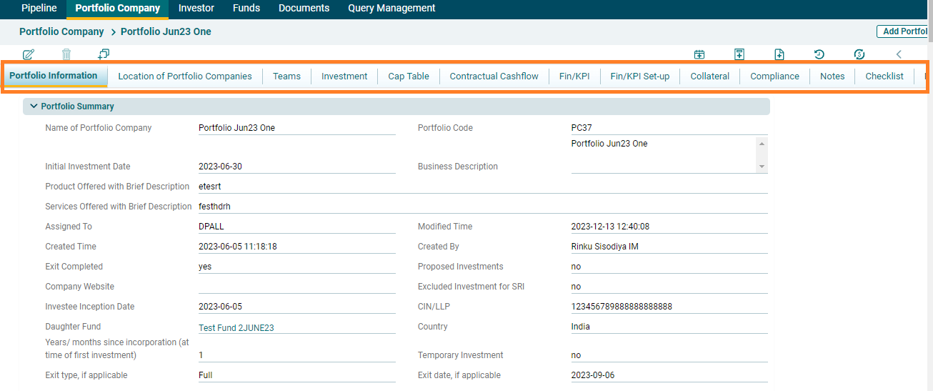 4. Once the Portfolio has been created, you will see different tabs here- Teams, Investment, Cap Table, Contractual Cashflow, Fin/KPI, Fin/KPI Setup, Collateral, Compliance, Notes, Checklist, and More Information. AIF user can fill in the required details by navigating to the respective tabs.