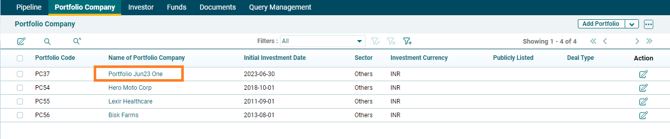 5. The created portfolio company can be accessed from the Portfolio Company menu. The company is visible on the Portfolio Company List View page.