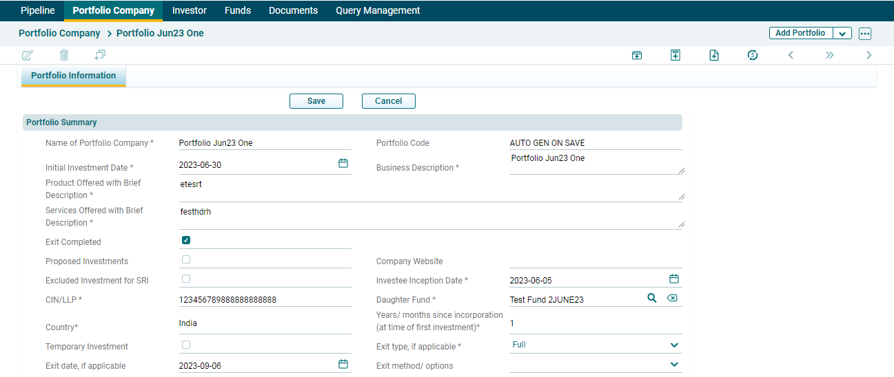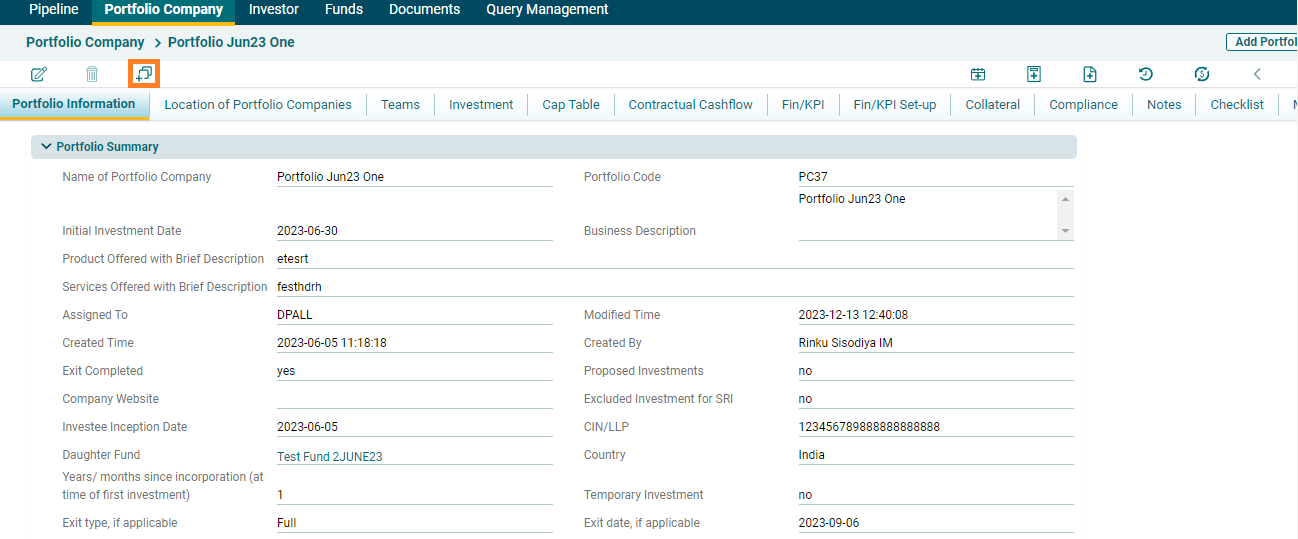 2. The Portfolio Campany Information window is displayed. Click on the Duplicate icon in the top left corner.