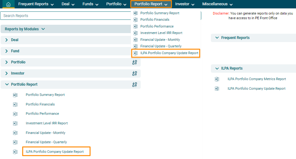 To view and download ILPA Portfolio Company Update reports, follow the below steps:
