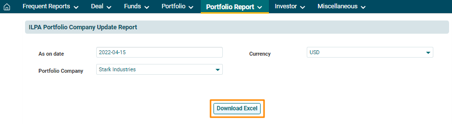 3. The ILPA Portfolio Company Update Report window is displayed. Specify the date until which you wish to download the report. Choose the portfolio company from the drop down list. Choose Currency. Click on Download Excel button. The excel file will download.
