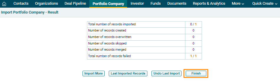 Records, Undo Last Import, and Finish. To complete the Import, click Finish.