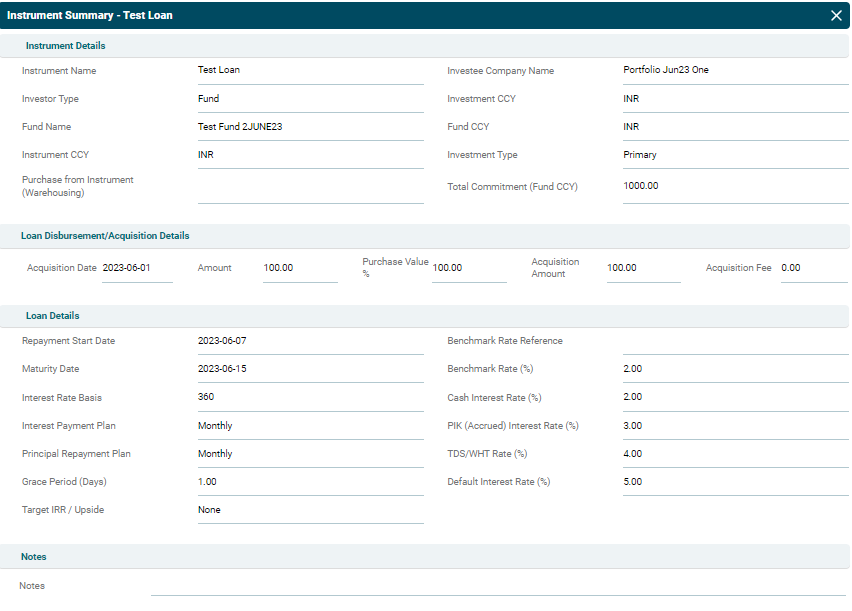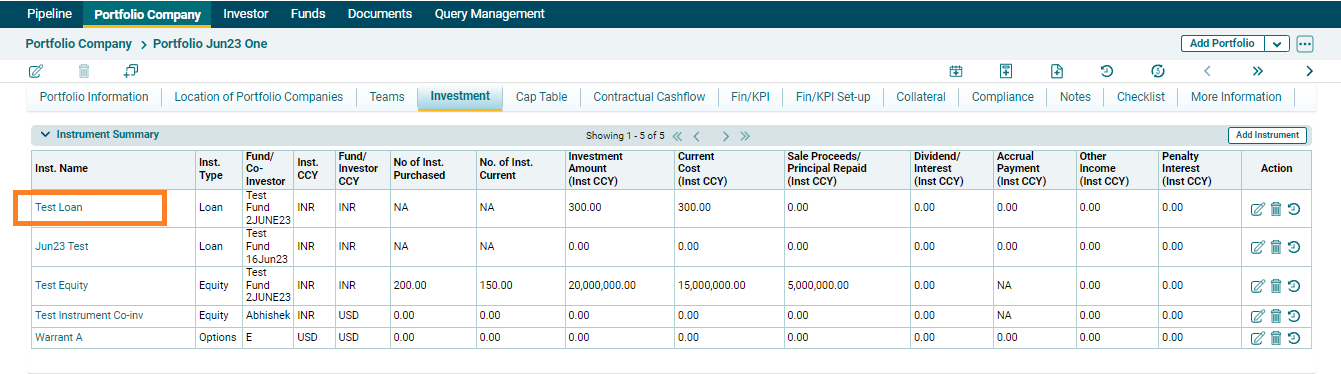Investment summary is summarized in three panels- Instrument Summary, Funds,