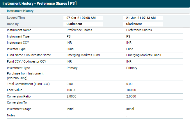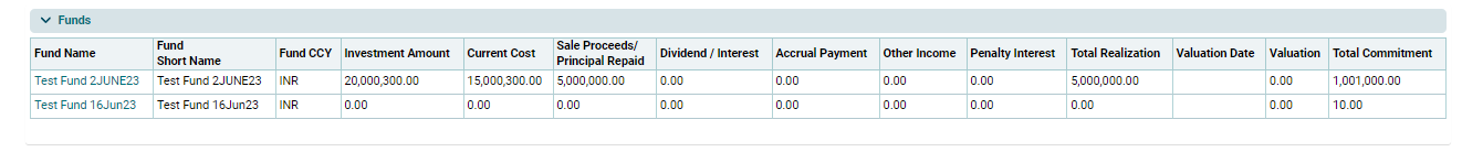 This panel allows you to view a detailed summary of investments made by funds in the portfolio company. The panel gets auto-populated based on the underlying transactions. The details included are: