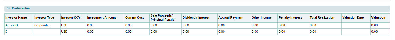This panel allows you to view a detailed summary of investments made by co-investors in the portfolio company. The panel gets auto-populated based on the underlying transactions. The details included are: