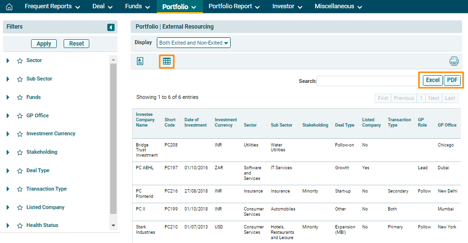 - Display: To view all the portfolio companies including Exited, Non-Exited, or Both Exited and Non-Exited.