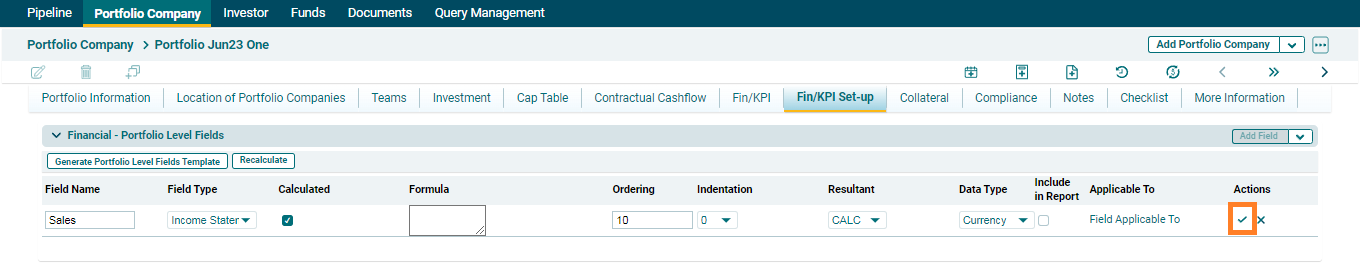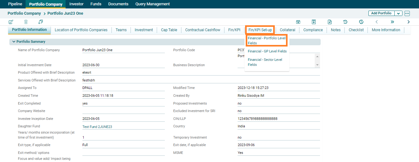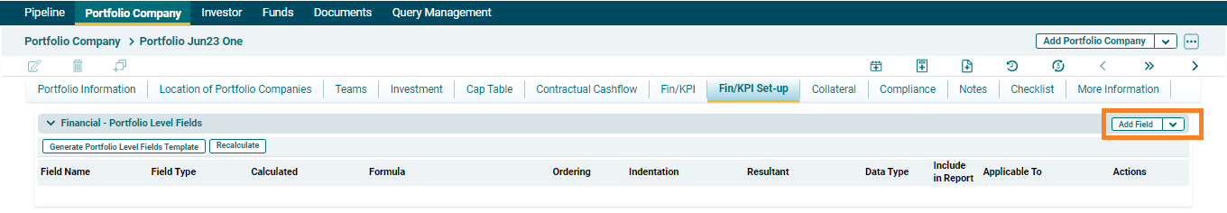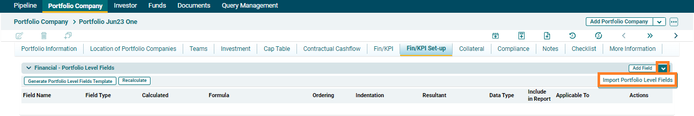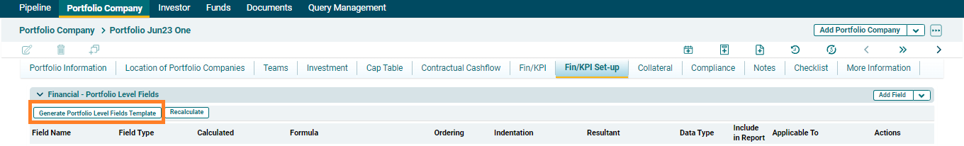 1. Navigate to Fin/KPI tab and click on Financial – Portfolio Level Fields.